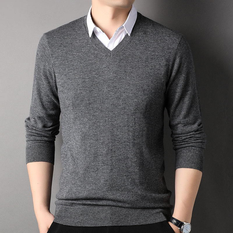 鄂尔多市纯山羊绒衫男衬衫领假两件套春秋薄毛衣男打底衫100%羊绒衫男t恤中年初秋爸爸装薄款衬衫领男士单穿衬衣 6171V领中灰 185/100