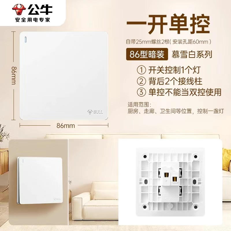 公牛开关插座面板G12系列大面板五孔插座 86型墙壁暮雪白插座开关 G12暮雪白 一开单控