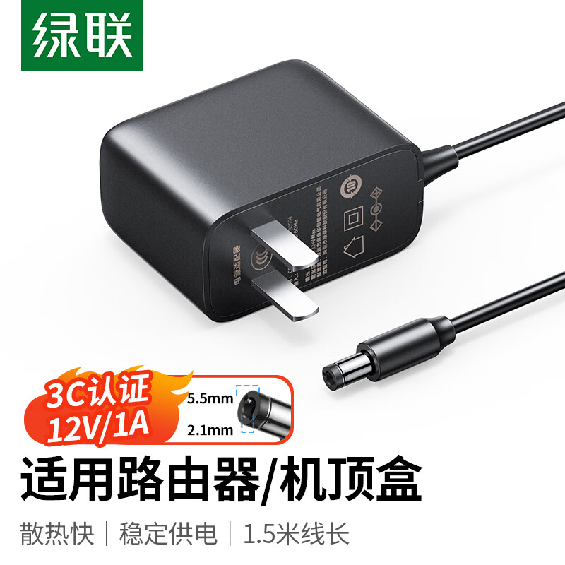 12V/1A电源适配器 绿联/UGREEN CD263-30594 黑色 1.5米