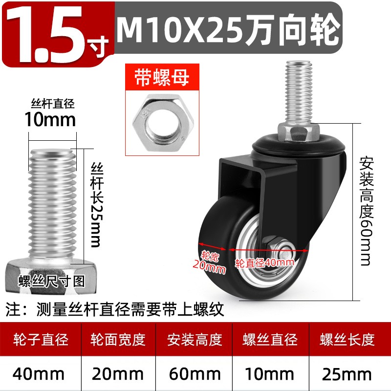 脚轮手推车丝杆滑轮聚氨酯滚轮轱辘 1.5寸M10*25万向轮(带螺母 )20只