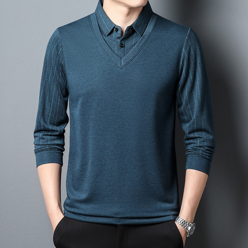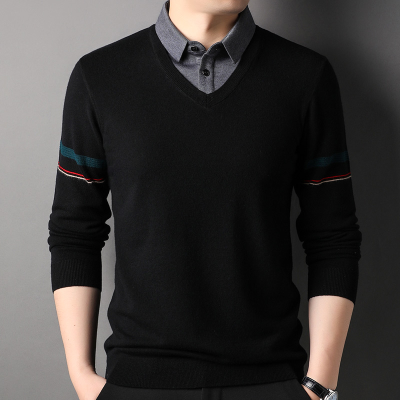 鄂尔多市纯山羊绒衫男衬衫领假两件套春秋薄毛衣男打底衫100%羊绒衫男t恤中年初秋爸爸装薄款衬衫领男士单穿衬衣 6183黑色 175/92