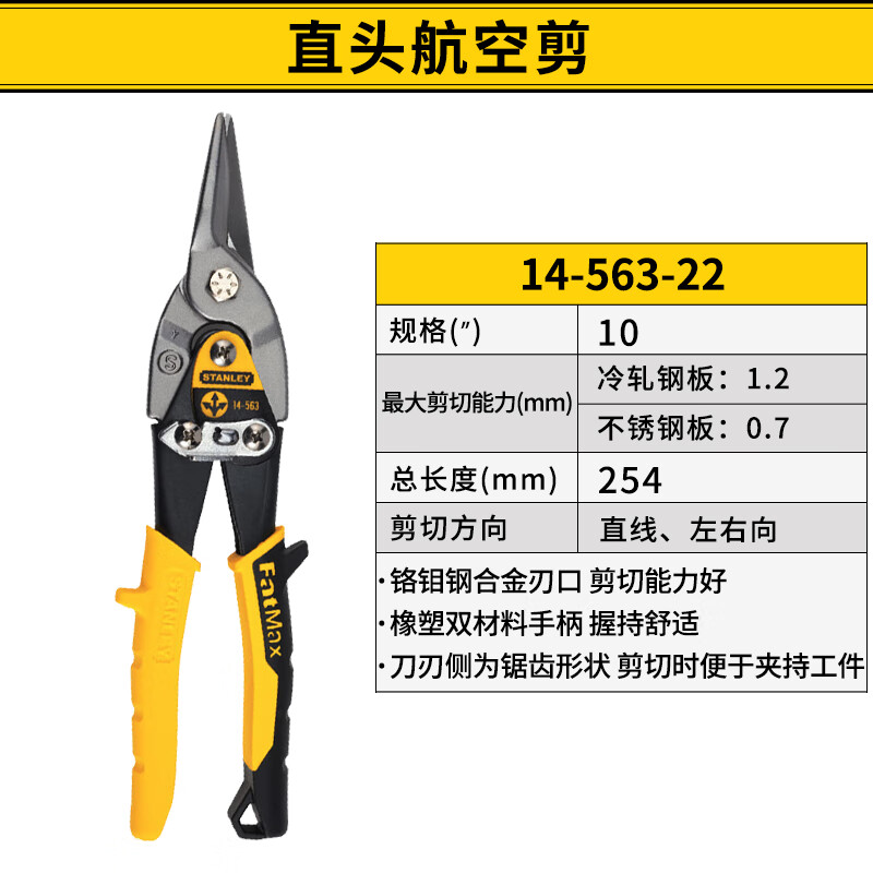 史丹利航空剪不锈钢铁皮剪刀工业级板钢板铝板钢丝铁网剪刀铬钼钢合金 直头切剪14-563-22