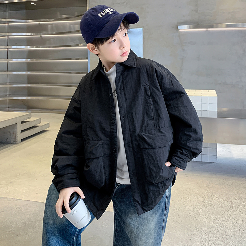 男童夹棉外套秋冬款新款男孩冬装儿童装冬季加棉加厚衬衫棉衣 120cm 黑色