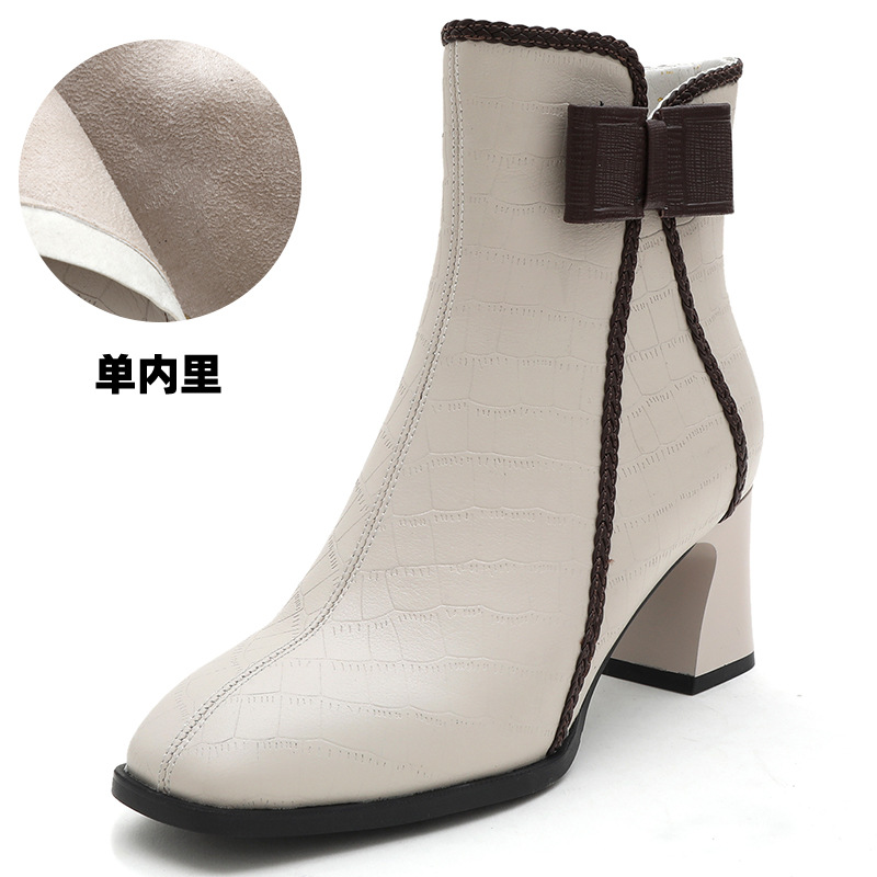 秋冬季新款粗跟中筒靴子女加绒棉鞋中跟尖头小短靴复古真皮鞋 米白单里 38