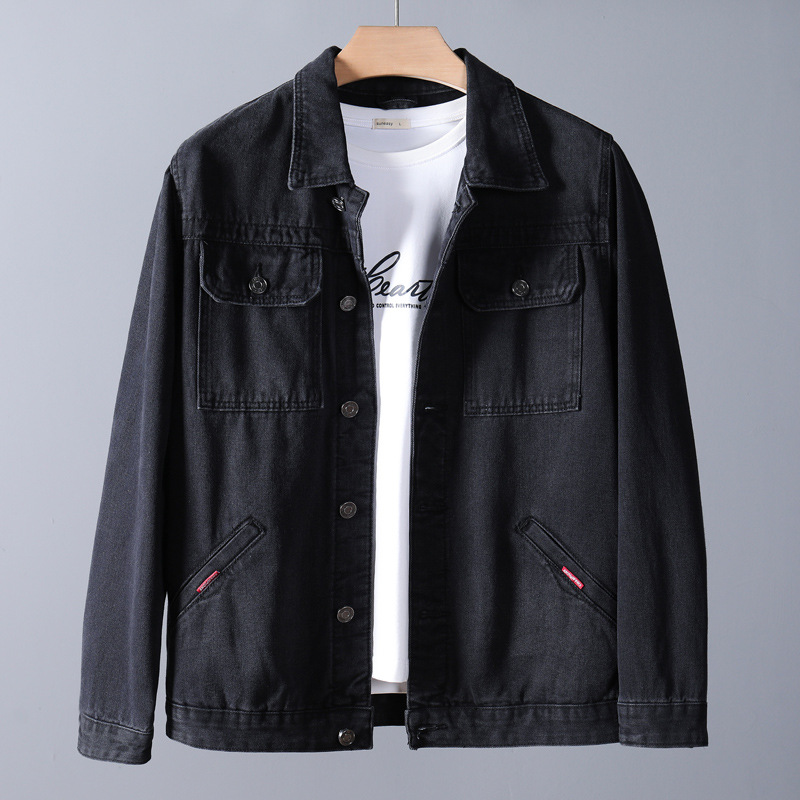 新塘牛仔外套男士春秋新款纯色时尚简约宽松潮流刺绣蓝色夹克上衣 L(120斤) 6025黑色