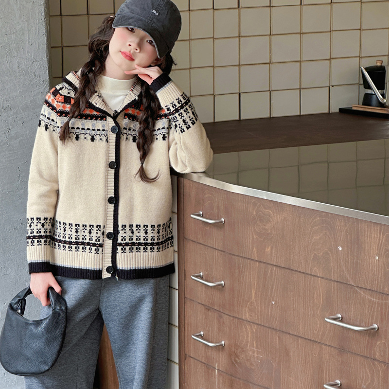 女童针织开衫秋季新款洋气女大童韩版连帽上衣儿童毛衣外套潮 120cm 杏色毛衣