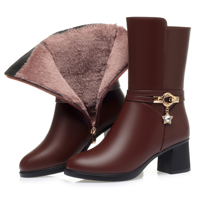 中筒靴女冬季新款女靴子粗跟妈妈棉鞋坡跟软底厚绒靴子中老年棉靴 棕色X-7358厚绒款粗跟5.5cm 42