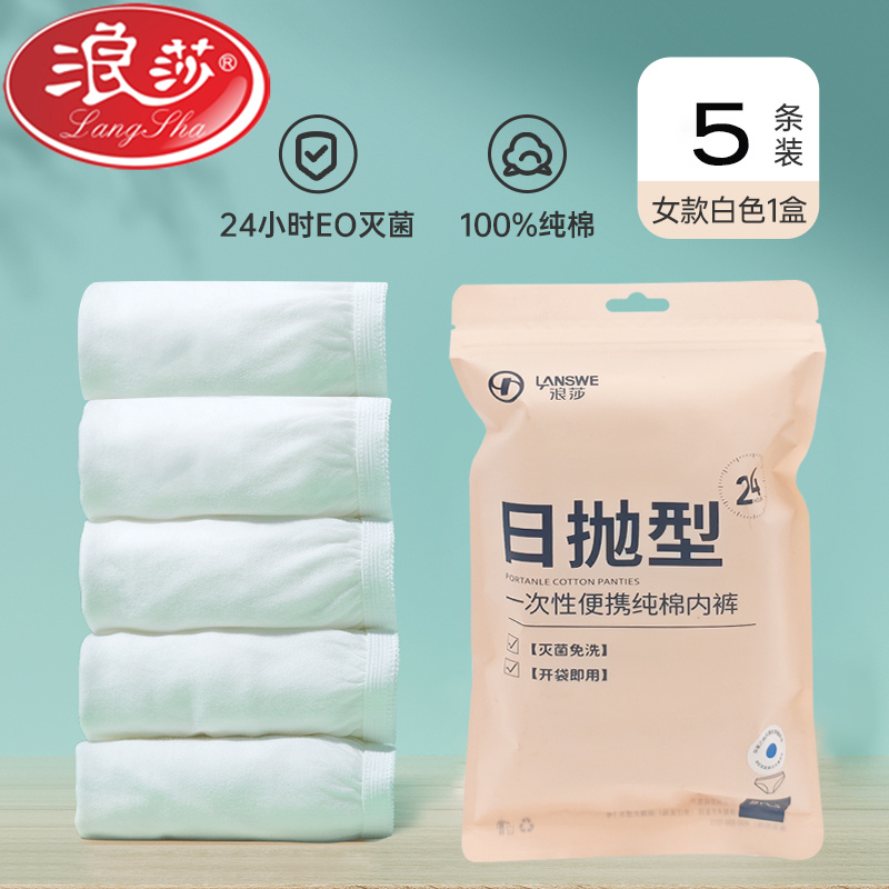 浪莎一次性内裤女士纯棉中腰无菌独立密封包装出差旅游免洗日抛全棉短裤5条 Y008/5条密封袋装/白色 170/XL(建议110-130斤)