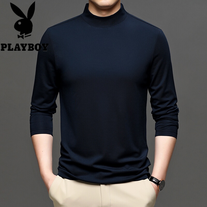 花花公子品牌男装含桑蚕丝纯色半高领打底衫长袖T恤男日系时尚百搭男士体恤衣服男2021秋季新_133 L码 哈青