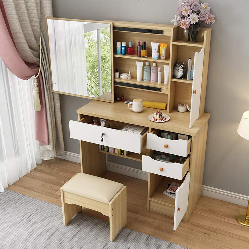轻奢智能镜梳妆台镜子带灯收纳柜一体简约网红风卧室化妆台 组装_868#胡桃白抽右柜_送梳妆凳