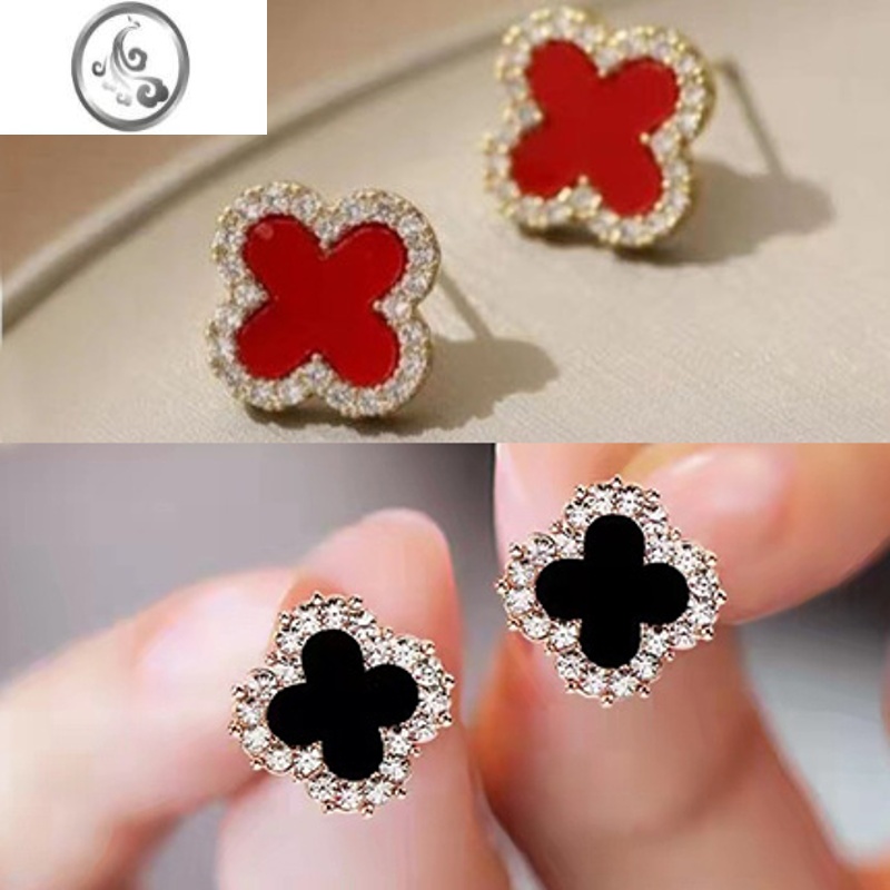 JiMi四叶草耳钉女士银银耳饰高端2023年新款潮洋气流行珍珠耳环坠 四叶草黑+红