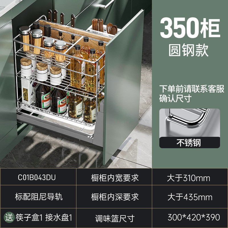 尔沫厨房橱柜调味拉篮不锈钢双层调料拉篮抽屉式调味品拉篮滑轨厨房收纳篮调料架调味篮 实心圆钢-350柜体