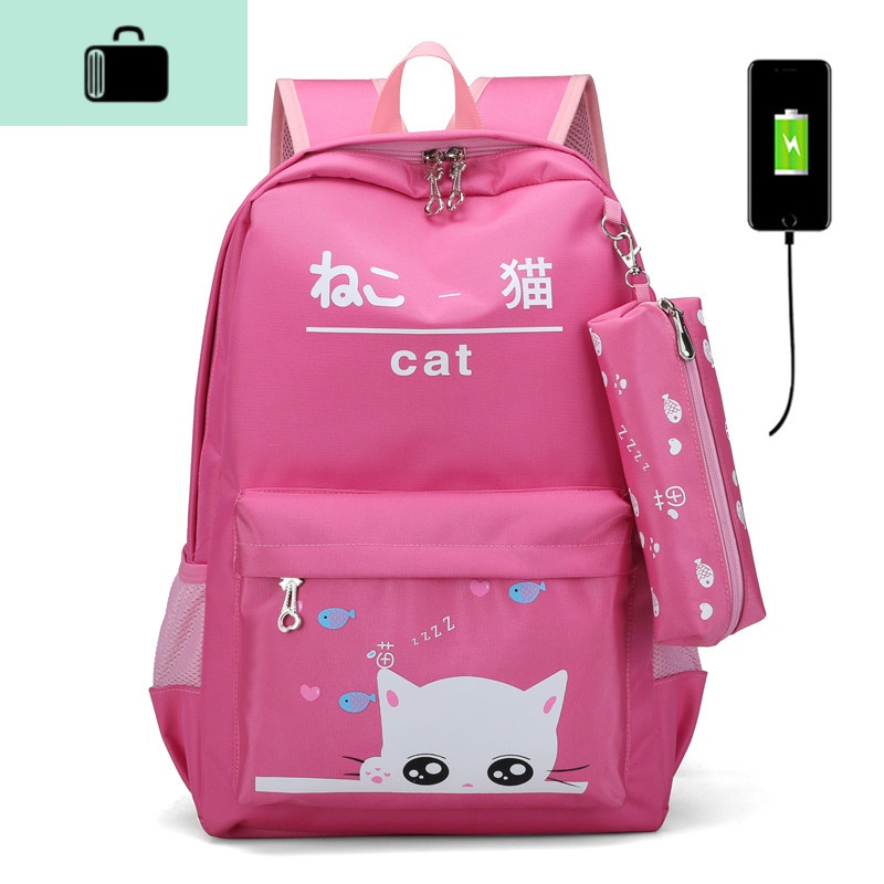 书包女中学生韩版学院风双肩包女初中生校园背包女生两件套带USBNEWLAKE 权猫粉色