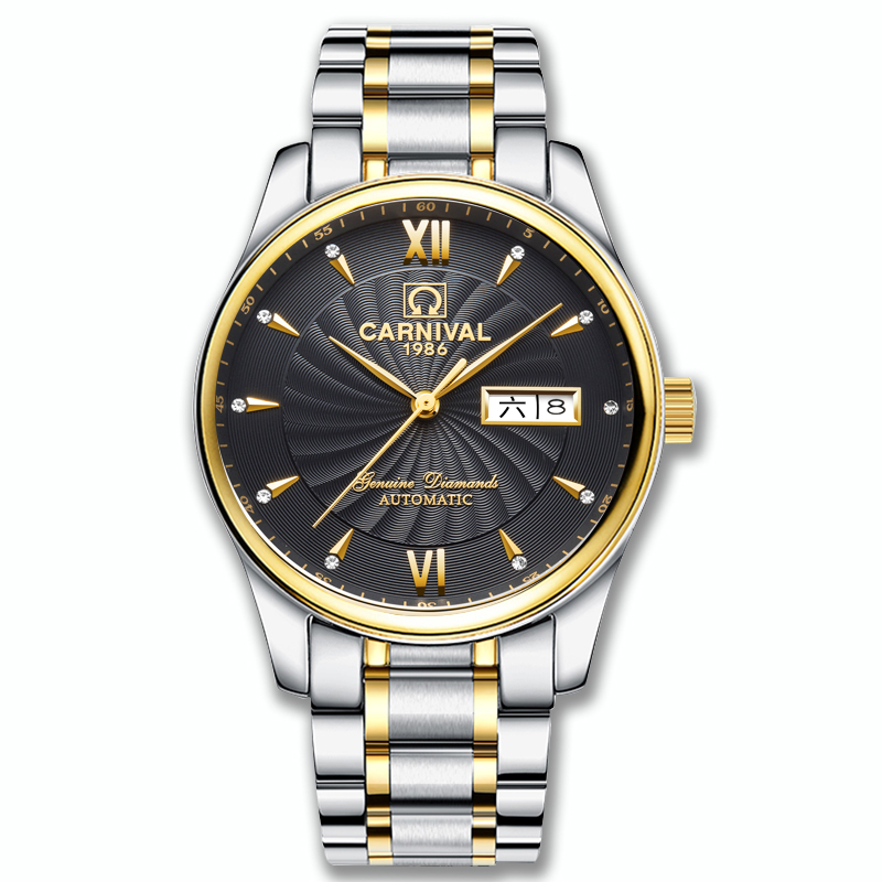 瑞士嘉年华CARNIVAL手表名匠商务男士系列双日历全自动机械表 男防水大三针镂空背透精钢男表正装时尚腕表8670G 间金黑面
