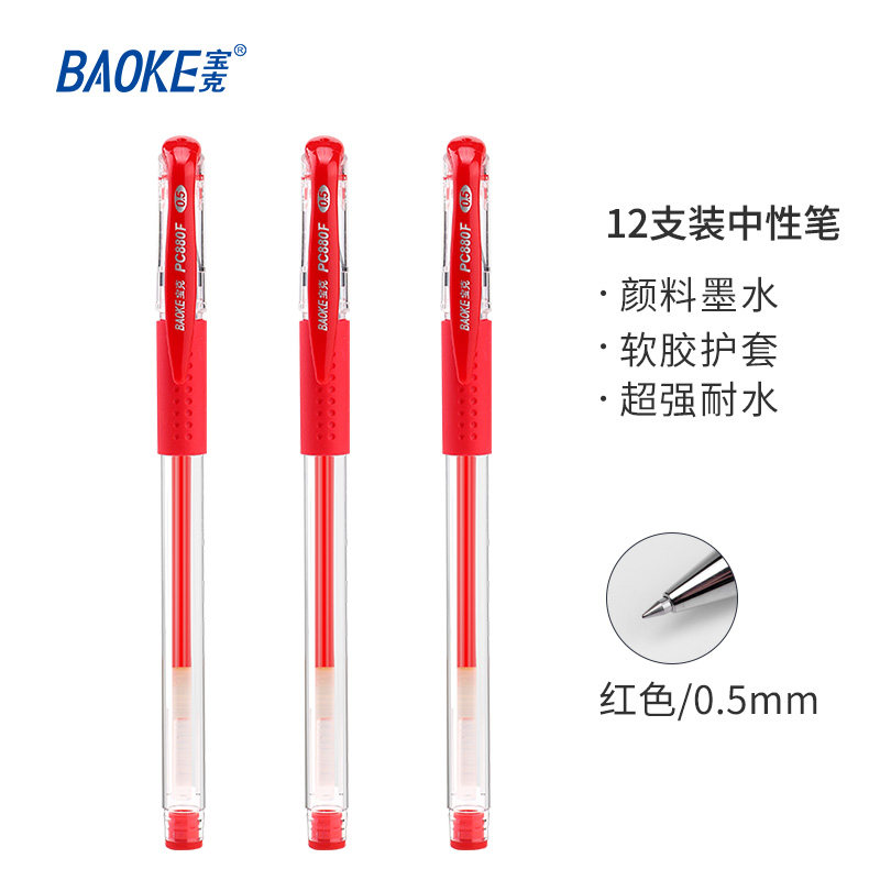 宝克(BAOKE)PC880F 0.5mm中性笔签字笔 12支/盒 1盒 880F红色12支