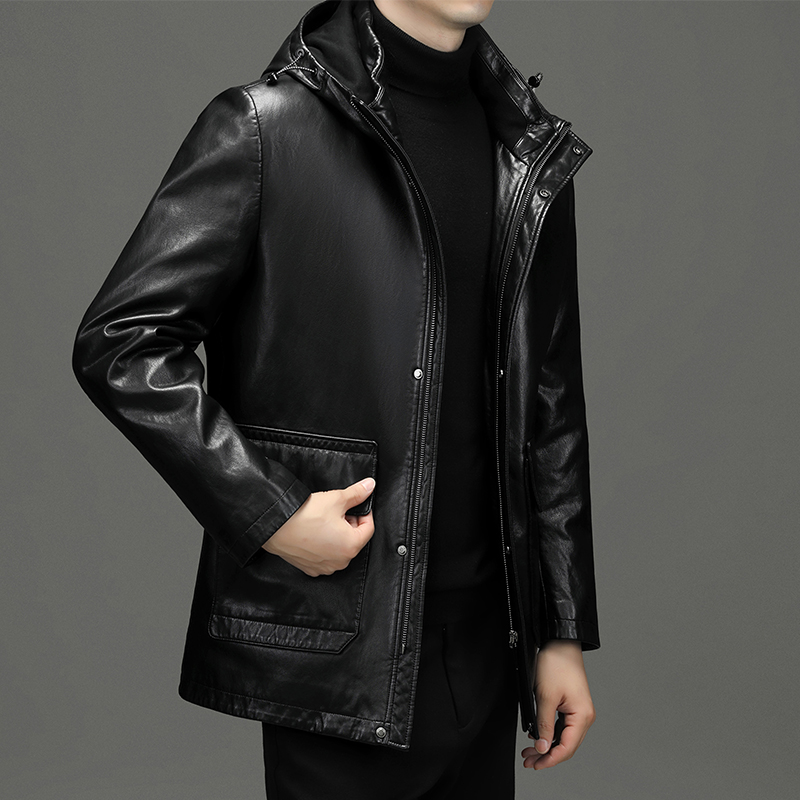 免费退换2021冬款正品绵羊皮真皮皮衣羽绒服男立翻领中长款加厚加绒皮夹克反季促销_509_542 180/92A 黑色可脱卸内胆