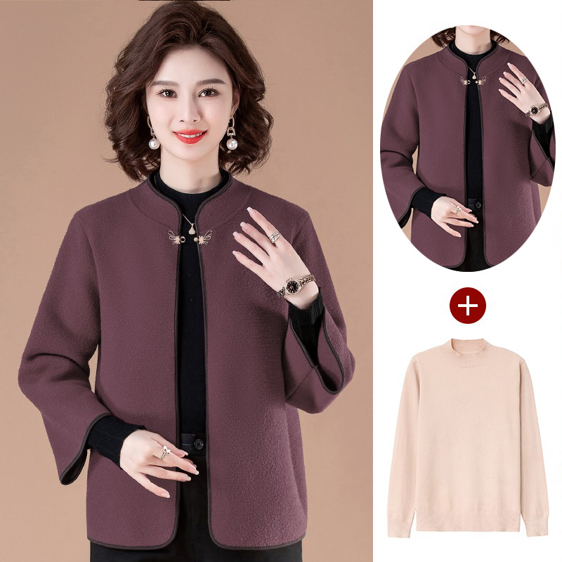 恒源祥喜婆婆喜妈妈春秋装披肩外套2024新短款中老年女羊毛呢上衣 XL105-120斤穿 豆沙紫+驼色打底衫