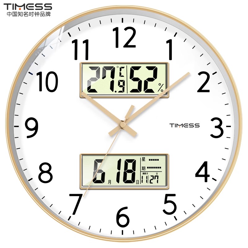 TIMESS日历钟表挂墙挂钟客厅家用时钟万年历双屏电子石英钟 12寸(直径30.5cm) 典雅金【双屏+日历温湿显示】