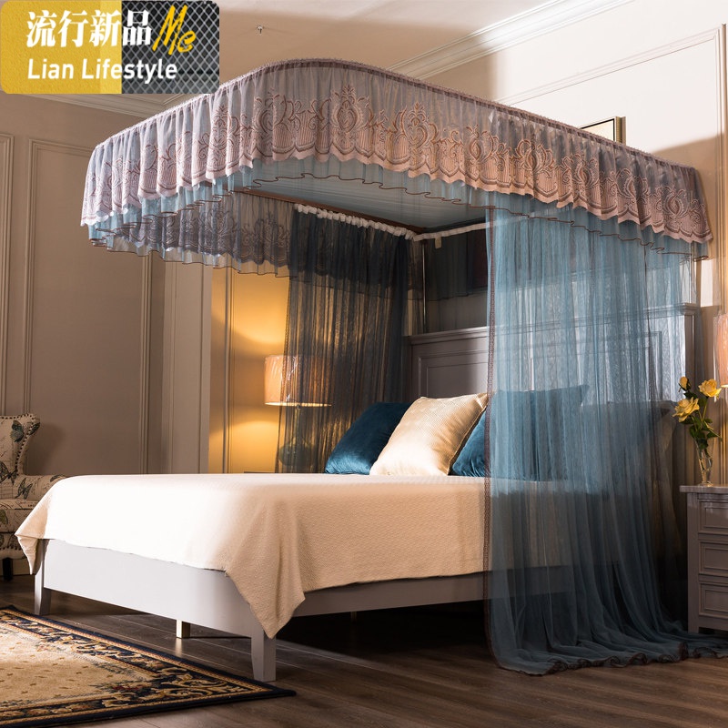 欧式导轨蚊帐家用1.8m床1.5米1.2落地公主风U型轨道宫廷纹账支架2三维工匠 1.5m(5英尺)床 深蓝【双轨道可升降】【升级加粗支架免螺丝易安装】
