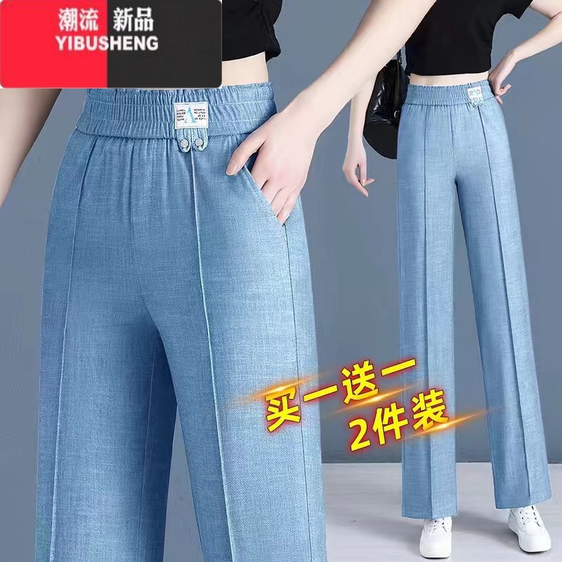 YIBUSHENG直筒牛仔裤女2024季薄款松紧高腰新款显瘦窄版阔腿裤休闲4 XL建议115-125斤 浅蓝2条优惠装