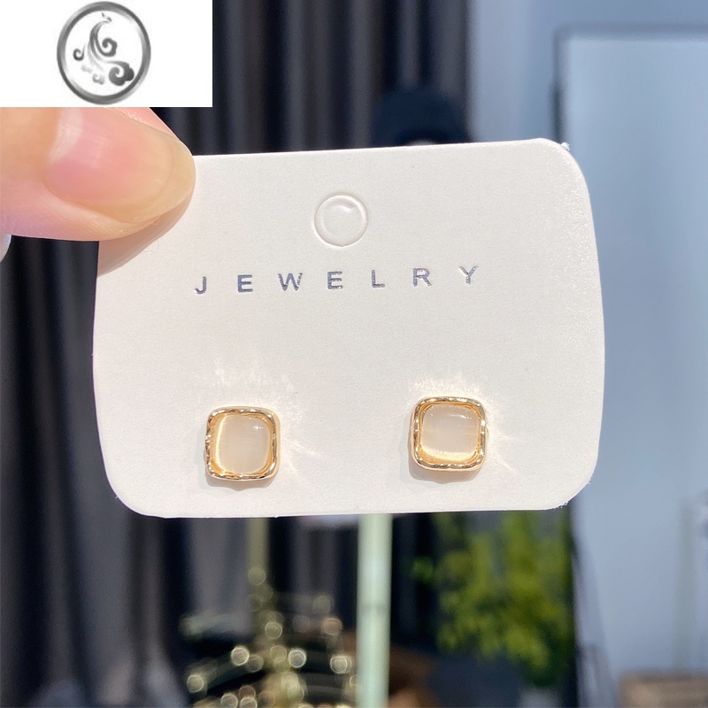 JiMi猫眼石耳钉女韩国网红气质耳饰新款潮耳夹无耳洞银银耳银 一对装方形白色