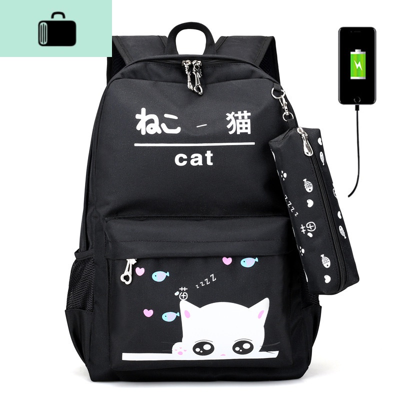 书包女中学生韩版学院风双肩包女初中生校园背包女生两件套带USBNEWLAKE 权猫黑色
