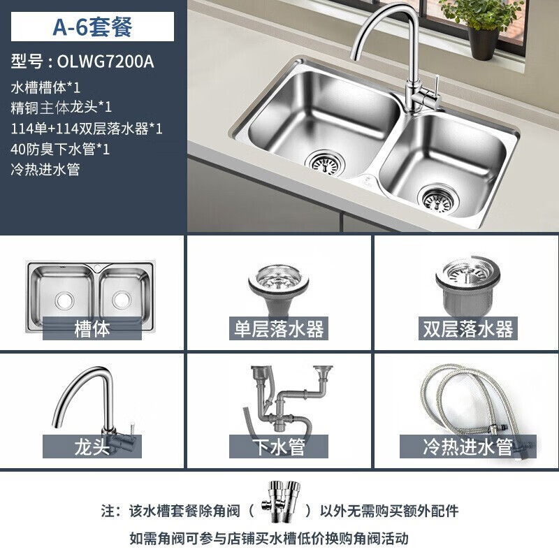欧琳水槽双槽304不锈钢厨房洗菜盆720*410台上台下盆水斗窄台面可适用7200A(零售云) 7200A+7512精铜龙头